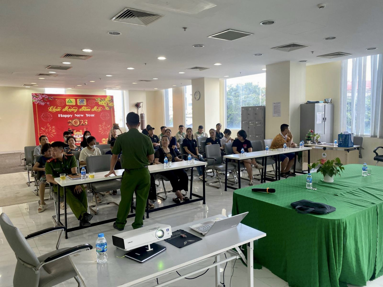 在这次培训中,海防市警察消防警察队重点宣传了大型设施发生火灾和爆炸时的逃生措施;火灾救援程序;直接教导一些高层建筑的逃生原则(使用紧急出口或绳索......),同时对使用手持灭火器和一些灭火工具进行实际指导。